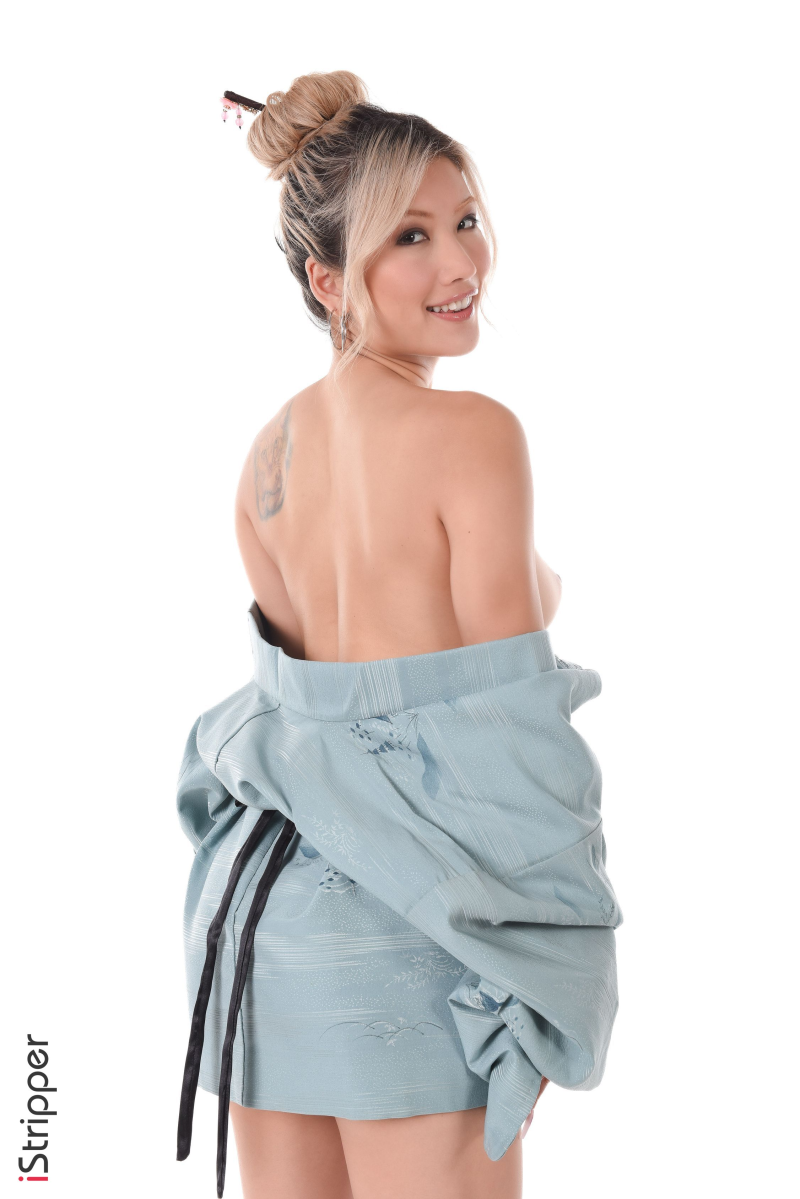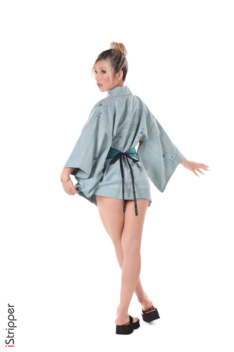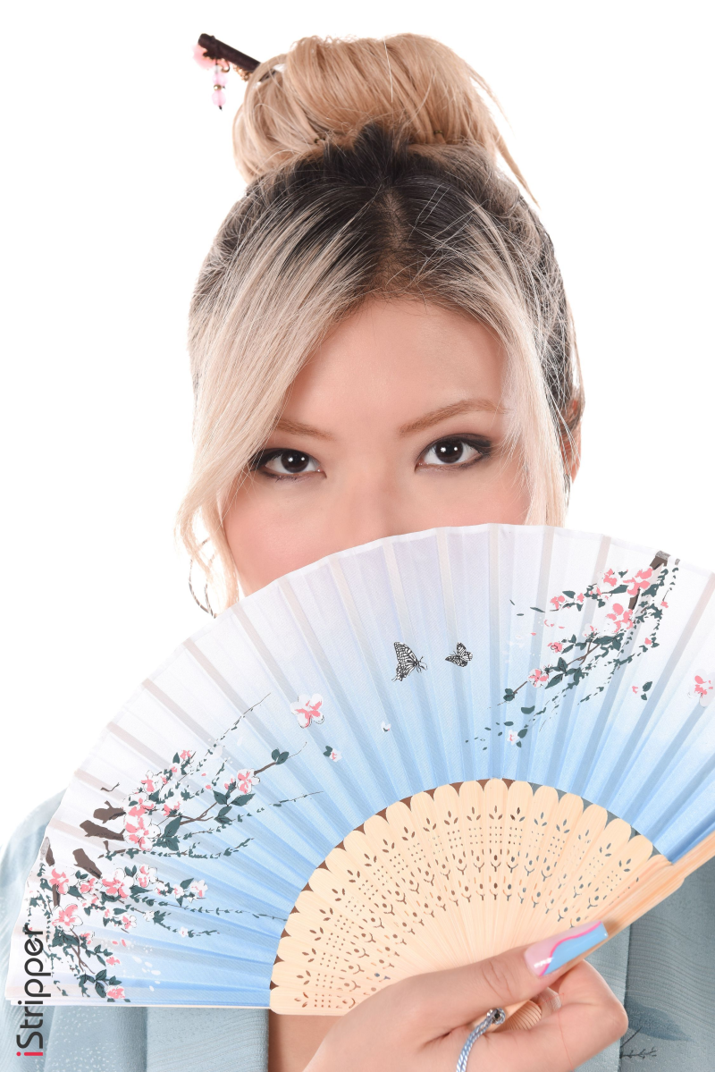 In "A Night In Tokyo", the dancer teases with the beautiful kimono wrapped around her body while she wields fans. She seductively begins to slowly unwrap her robe, with glimpses of her bare skin and body revealed as she performs.