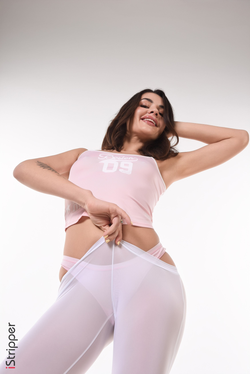 The "Let's Get Active" scene features Esteria looking incredibly playful in sheer white athletic leggings and a cute pink tank top, confidently posing with a water bottle. She teasingly adjusts her alluring attire, revealing her amazing physique and generating immense excitement throughout the performance.