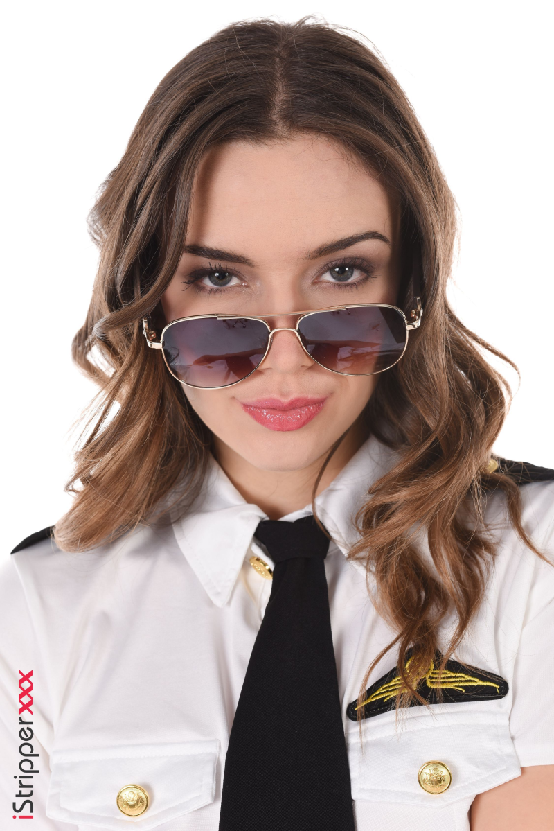 In "Close To Heaven," Hope Heaven is a sassy pilot, teasingly revealing a short white top that exposes her navel and a black tie. She wears a little skirt that barely hides her hips and gives a mischievous look at the camera with sunglasses, ready to take off for a sensual lap dance!