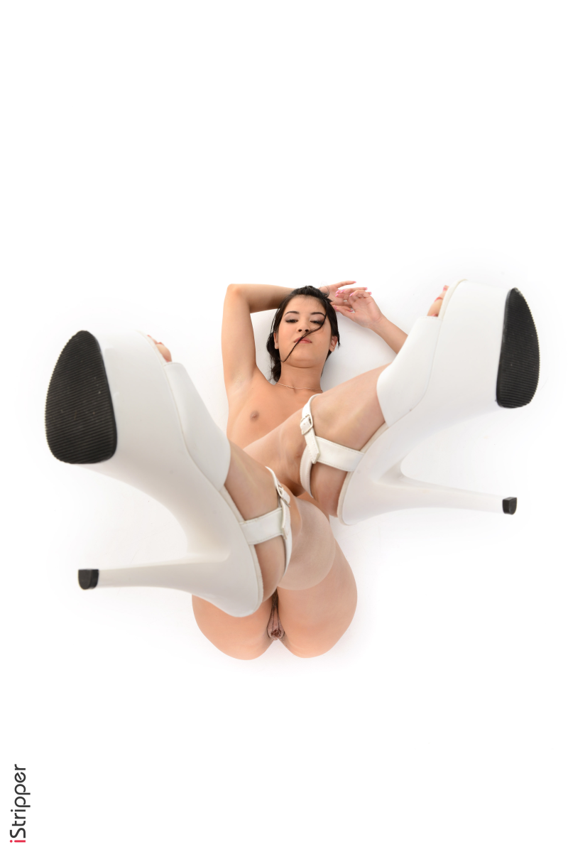 The striptease scene "All Night Long" features stripper "Lady Dee" wearing a white lingerie set composed of a bra, panties and a see-through robe. At the beginning of the scene, she is wearing white high heels and her hair is tied up. She sensually removes her robe. As the scene progresses, she continues to dance and pose seductively while removing pieces of her lingerie until she's fully nude, all while maintaining eye contact with the viewer. Her movements are fluid and graceful, and her expressions range from playful to sultry. She uses her hands to caress her body, drawing attention to her curves. The scene gradually builds in intensity.