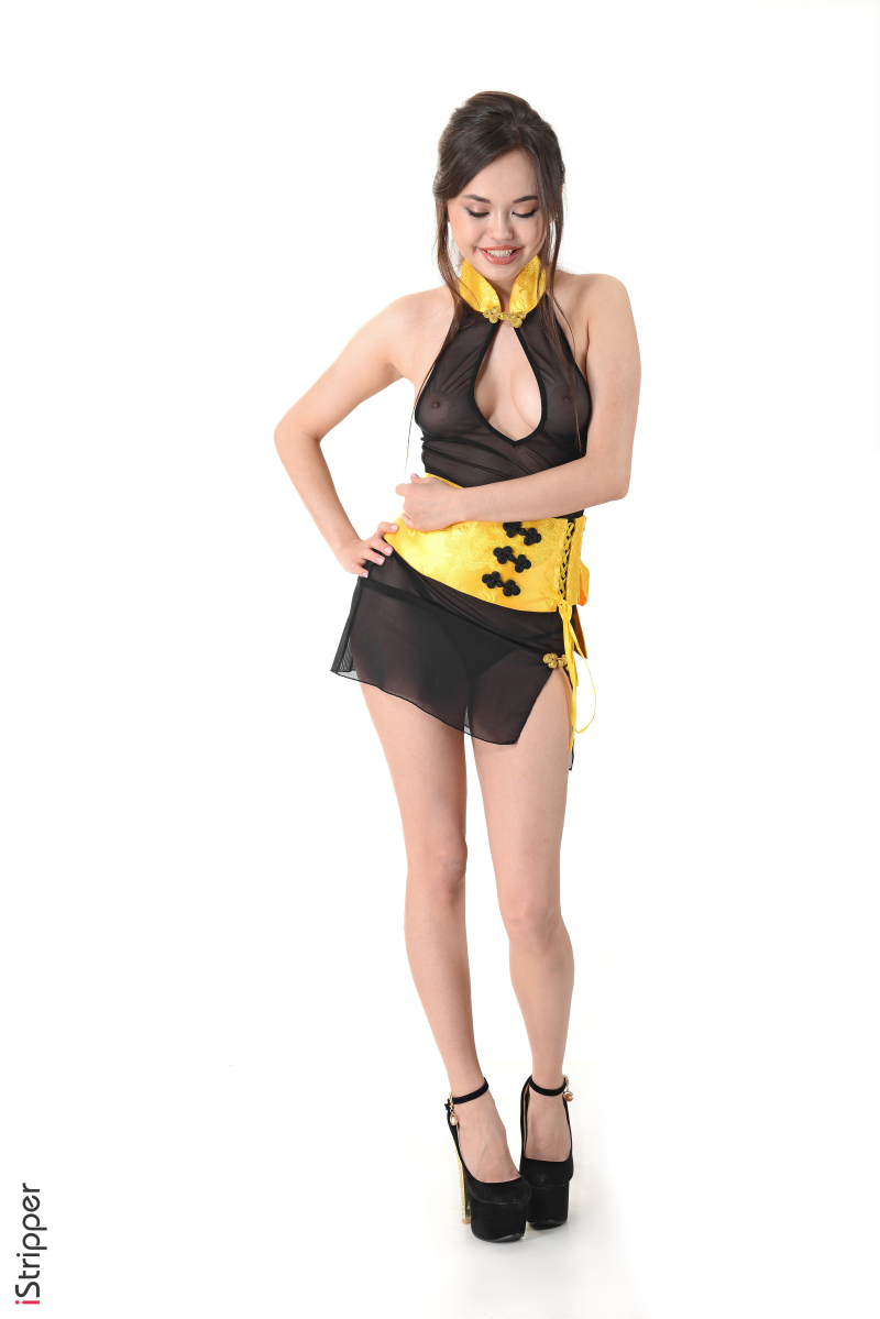 The striptease scene "Oriental Express" is starting, the stripper is wearing a see-through black dress with a yellow waist strap. Li Moon is smiling at the camera as she is about to start to remove her costume to give a great show!