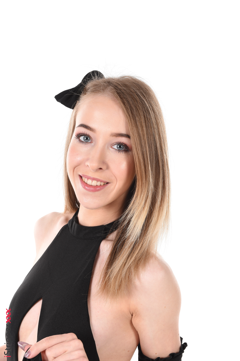 The striptease scene "Backless Black Dress" features stripper Nata Ocean wearing a short black dress, high heels, and a bow in her hair. She begins by lifting her dress to reveal her buttocks and the side of her breasts. She then removes the dress completely, exposing her full nude body. Next, she lies down and plays sensually with her breasts and vagina. Finally, she stands up, turns around, bends over, spreads her buttocks, and shows her anus.