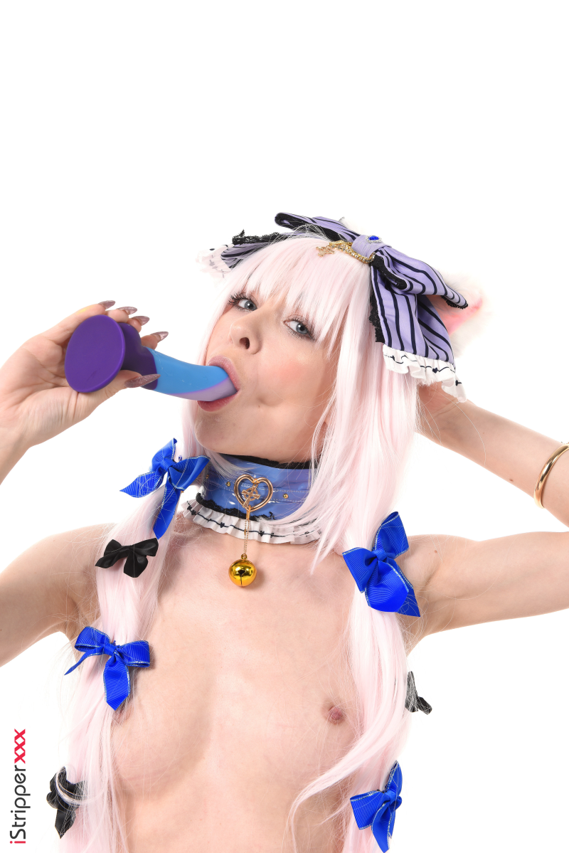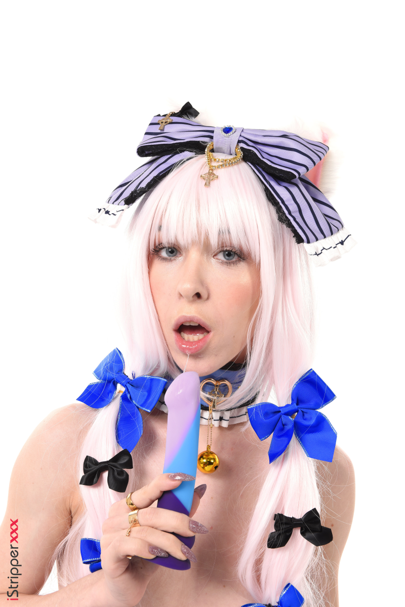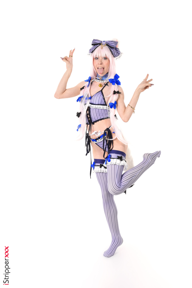 The striptease scene "Whooping It Up" features Nata Ocean, a stripper dressed in a playful, light-purple and blue outfit with cat-themed accessories like ears, a tail, and a bell-adorned collar. Her attire includes thigh-high stockings, a short skirt, and a revealing top. Nata begins by striking various poses, showcasing her body and costume. She sticks her tongue out, plays with her fingers, and moves her body in a suggestive manner. Gradually, she lowers herself towards the ground spreading her legs and starts touching her genitals. Her expressions and movements become increasingly explicit as the scene progresses, culminating in intimate displays of her private parts.