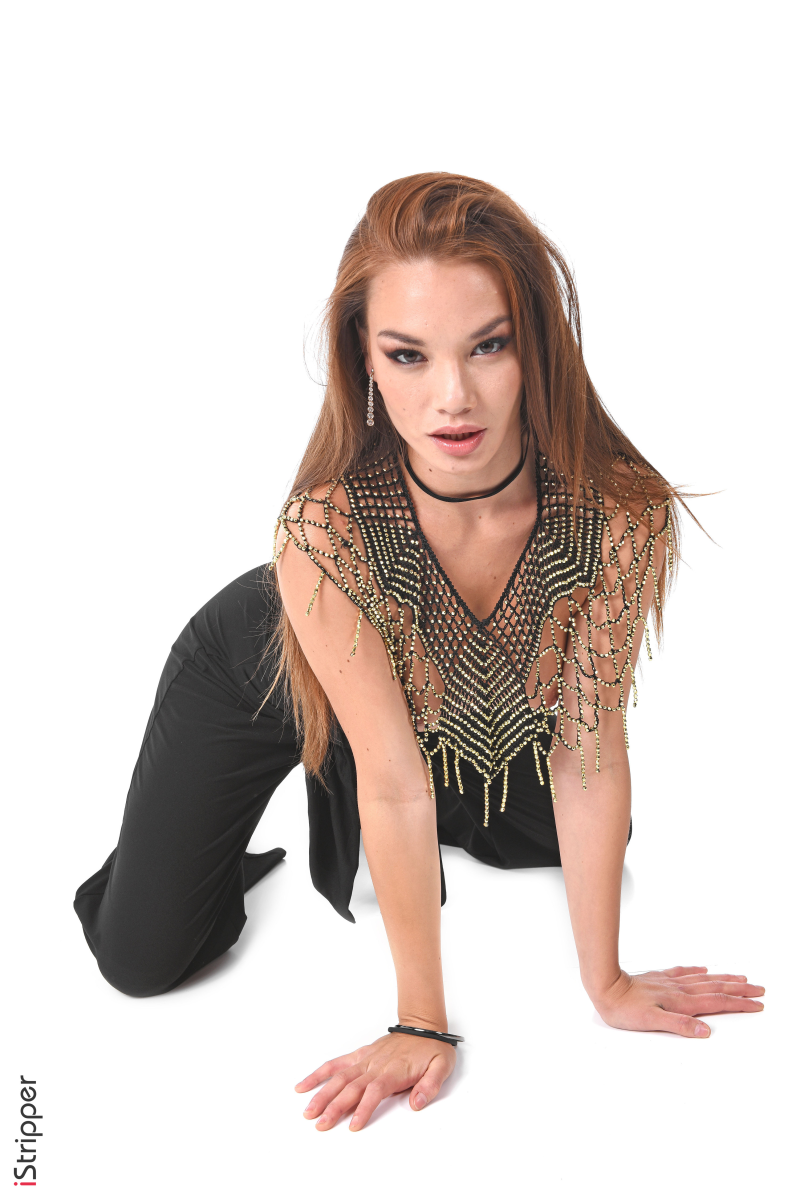 The "Exotic Love" striptease scene has Nici starting her routine with elegant black pants, high heels, and a very interesting beaded top that shows her upper breasts. She shows off her figure in a delicate and sensual way, enticing the audience into wanting more of this striptease.