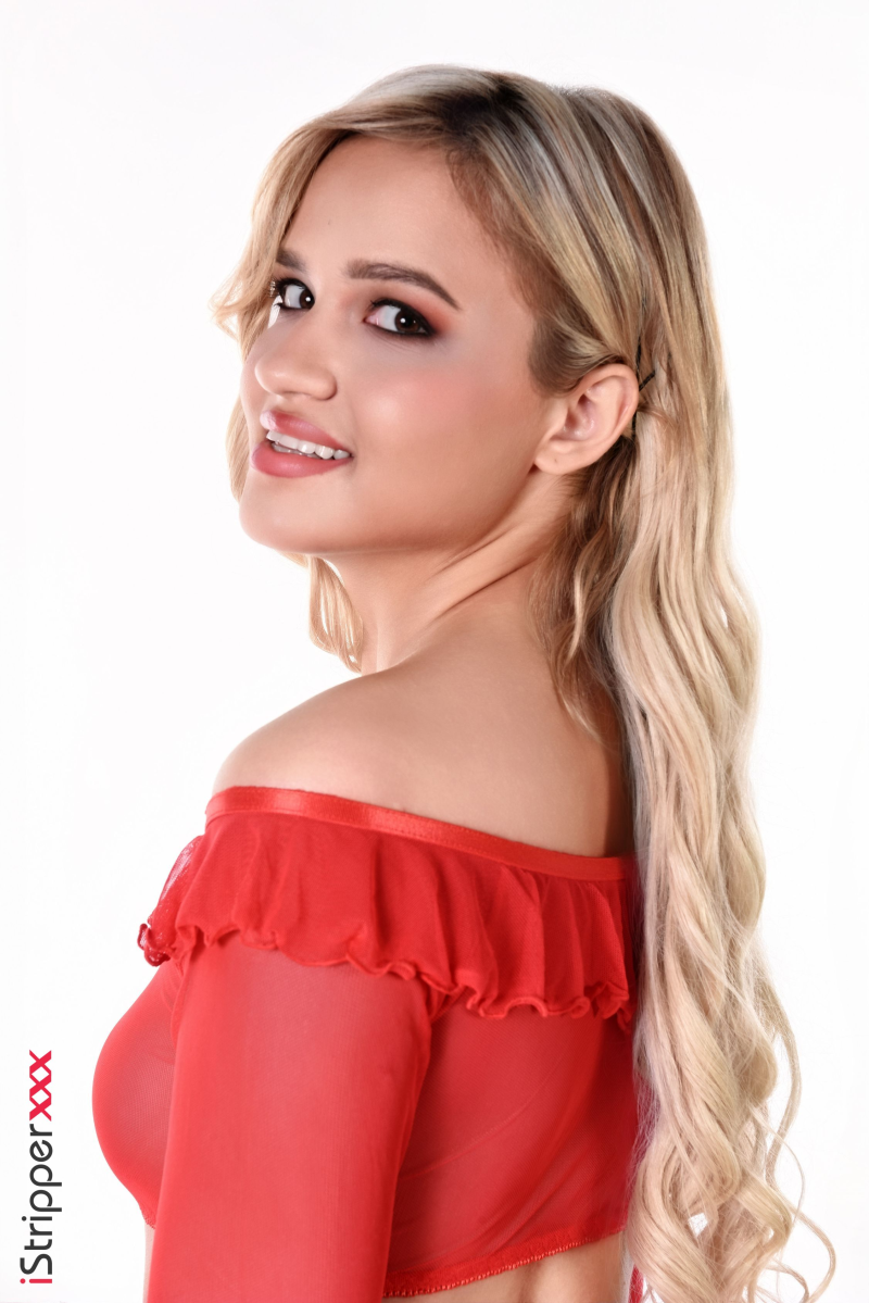 Oh my! Novella Night in the striptease scene "Feeling Spicy" looks so sexy as she shows off her red sexy outfit and reveals her body. She is really hot with her blonde hair and great body in her cute high heels as she undresses.