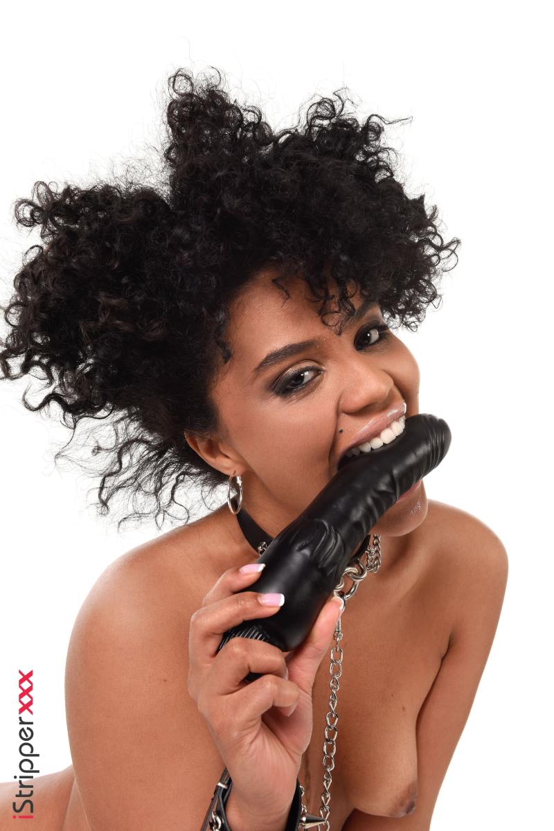The striptease scene "A Cheerful Flogging" features Selva Lapiedra, a dark-skinned woman with curly, voluminous dark hair. She's wearing a black bodysuit with snap buttons down the front, black fishnet stockings, and black high-heeled boots. A studded black collar and a silver chain are around her neck. She holds a black flogger and interacts with it throughout the scene, sometimes playfully brandishing it, other times biting it suggestively. In some pictures, Selva adopts provocative poses, such as squatting and looking back over her shoulder or crawling while holding the chain attached to her collar in her mouth. The overall impression is one of flirtatious dominance and playful sensuality.