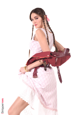The striptease scene "Sexy Flower Peddler" features stripper Sonya Blaze. Initially, Sonya is fully dressed in a pink and white checkered dress, a reddish-brown cropped jacket, and brown boots. She has two braids and is holding a wicker basket of flowers. As the scene progresses, Sonya begins to undress, first by lifting her dress to reveal her legs and panties and then fully removing her jacket and dress. The scene continues with Sonya posing seductively in her lingerie and heels, using the basket as a prop, and ends with her completely nude.