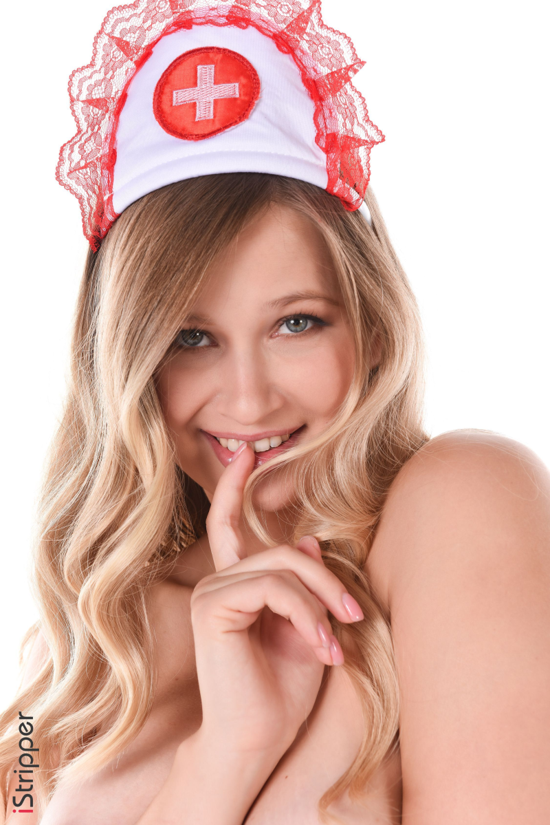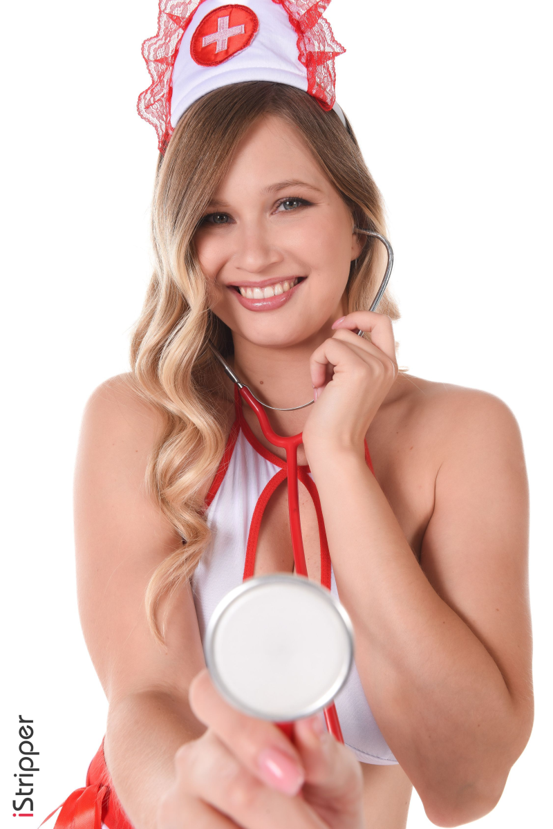 The stripper Stella Cardo is doing a striptease scene called "Listen to My Heart Beat" where she is dressed in a nurse uniform, complete with a red and white dress, white stockings, and red heels, she is posing with a stethoscope and is ready to examine you! With her infectious smile, Stella is prepared to provide the best medical care you have ever seen.