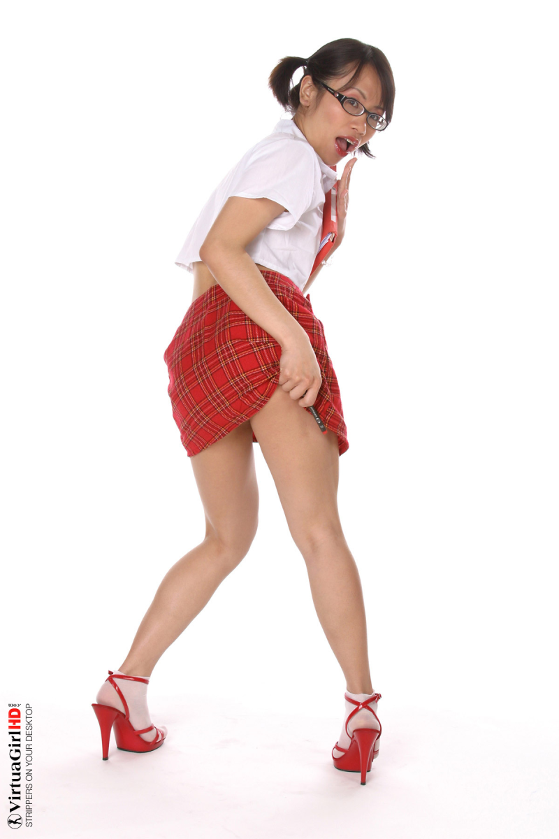 The striptease scene "Strawberry Time" features stripper "Ting" wearing a short white shirt, a short red plaid skirt, white socks, and red high heels. She also wears glasses and has her hair tied in two ponytails. Initially, she stands holding a red folder and a pen. As the scene progresses, she lifts her skirt, gradually revealing her buttocks and pubic area. She continues to lift her skirt until it is above her waistline, exposing her lower body. Eventually, she lowers her skirt and adopts a playful pose, looking over her shoulder towards the viewer.